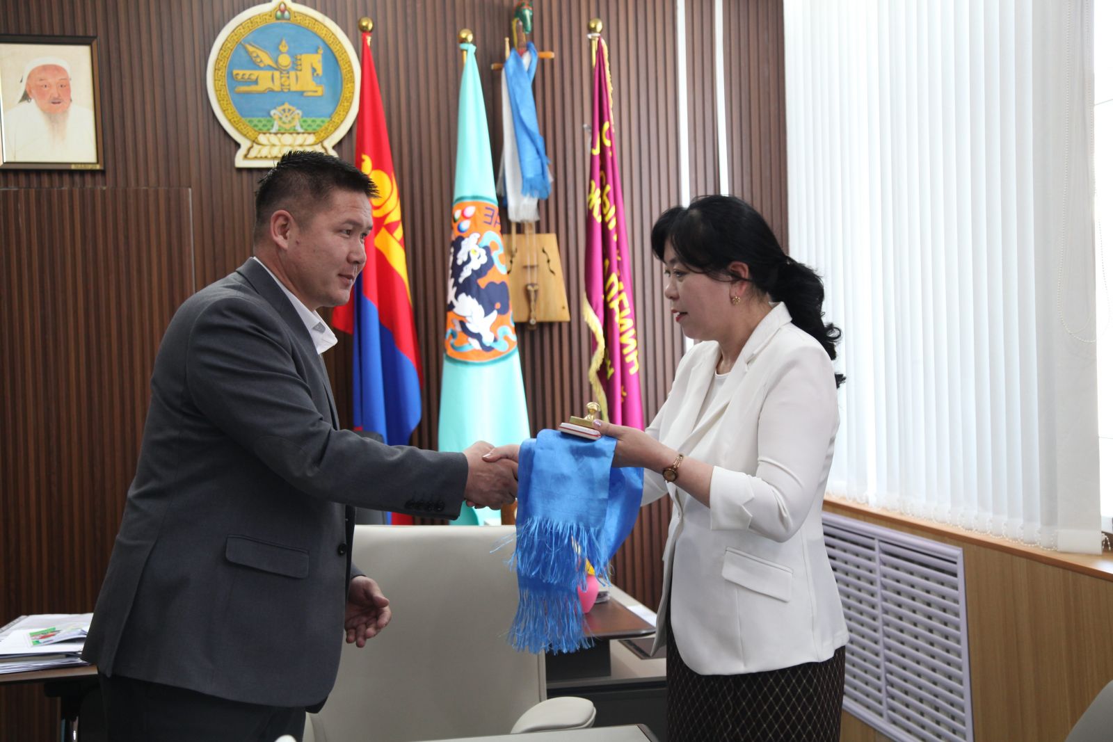 Жаргалант сумын Засаг дарга Л.Учрал шинээр томилогдож буй Жаргалант сумын Засаг даргын Тамгын газрын дарга Г.Баасансүрэнд сумын Засаг даргын 2025 оны Б/08 дугаар захирамжийг уншиж танилцуулан, тамгыг нь гардуулан өгөв.